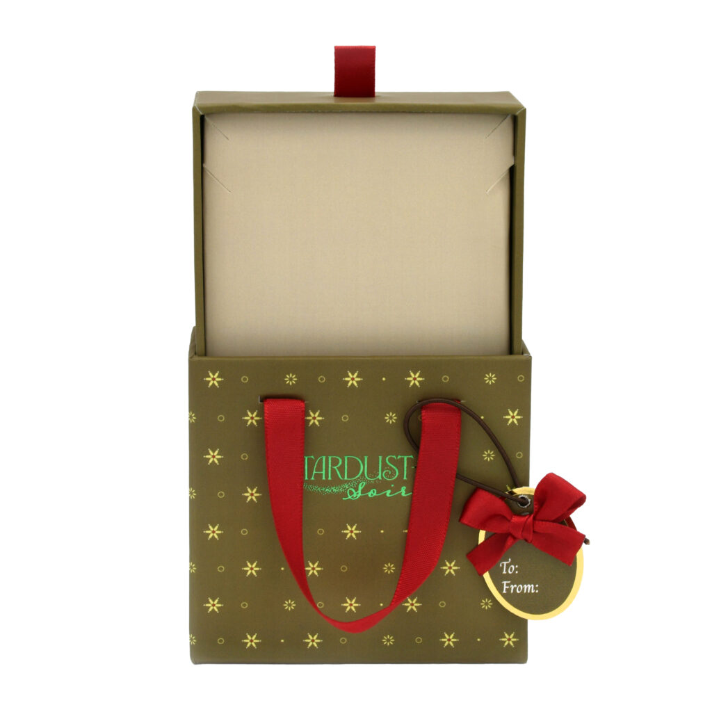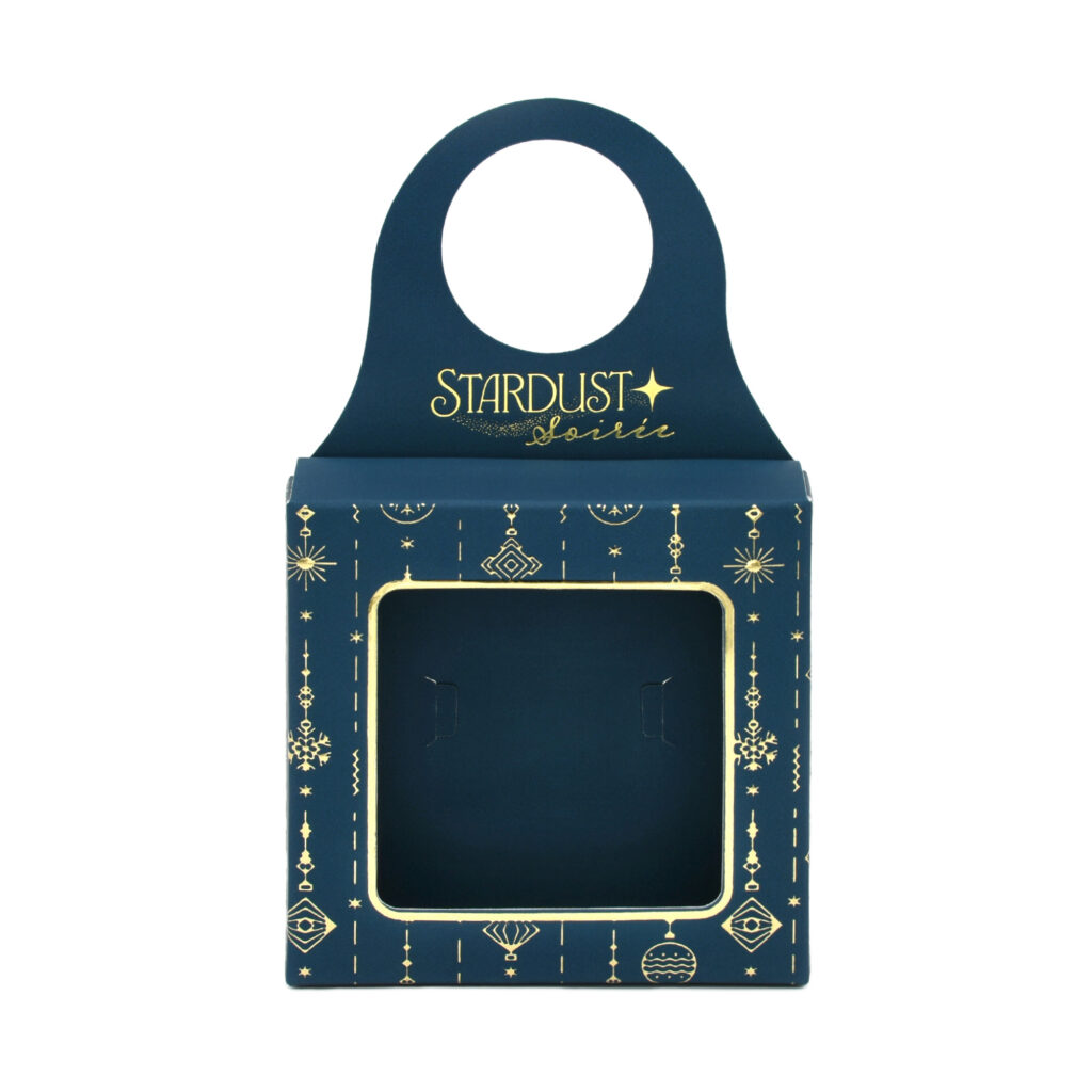 Stardust Soiree was the first trend I created based on my research. It focuses on the glamour and enchantment of celestial designs and sparkling elegance. It emphasizes metallic shimmer finishes on richly colored matte papers for its luxury look and feel. Materials such as applied plaques, ribbons, and 3D printed foiling adds dimension and a more personalized, fancy unboxing experience. The palette focuses on luxury, with deep colors like burgundy, plum, and dark blue as the rich backgrounds to complement the silver and gold foils.