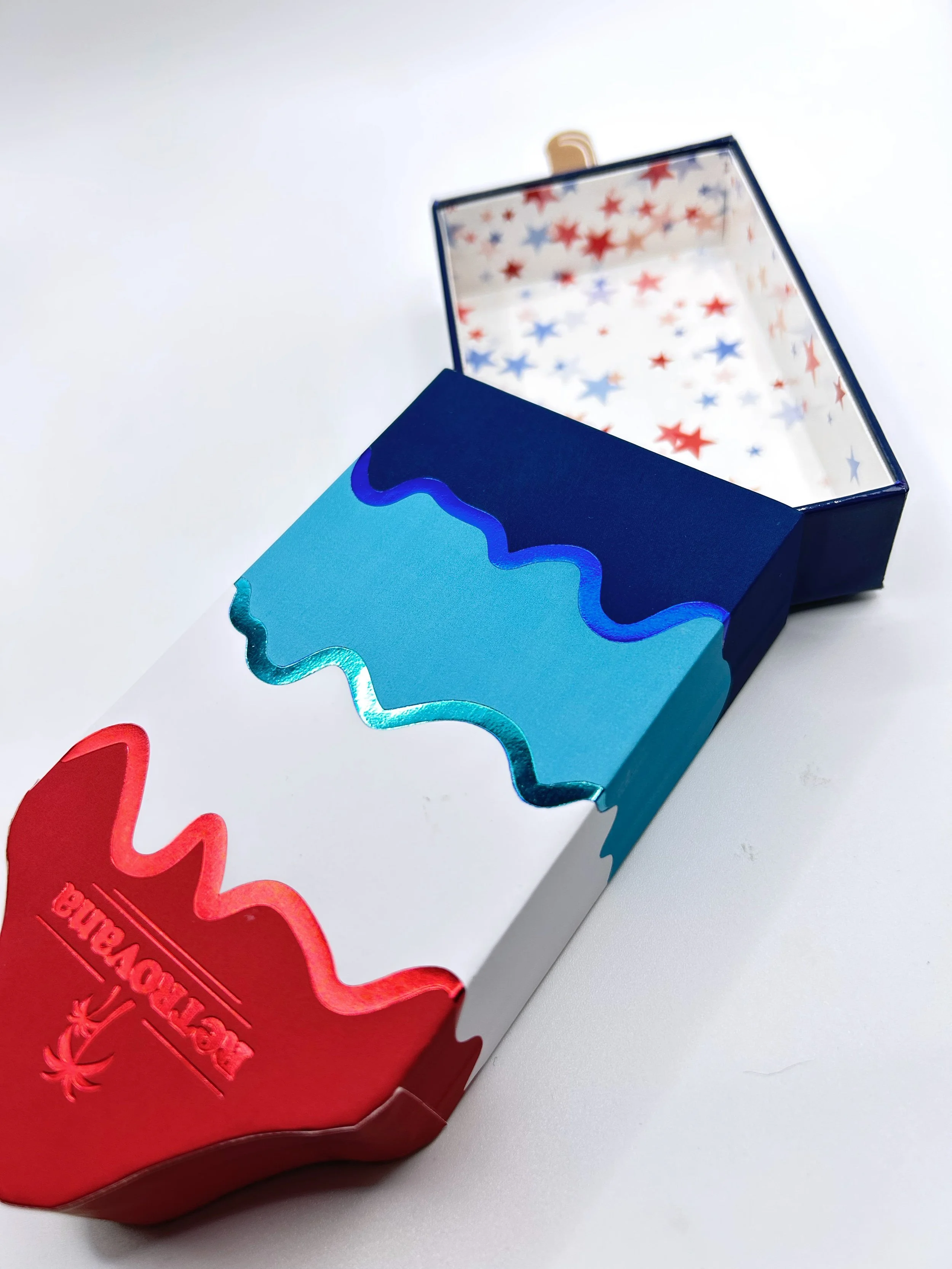 After researching, I choose a focus point and a selection of colors that will be the most prominent. I then design a mood board to help customers visualize the trend. Naming the trend to correlate to the theme helps immerse you completely into the theme and it gives the packaging a logo so customers can see where their logo would be displayed and how the packaging can be customized to fit their brand. For holiday, I created and designed two different trending brands because of the difference in colors and styles.